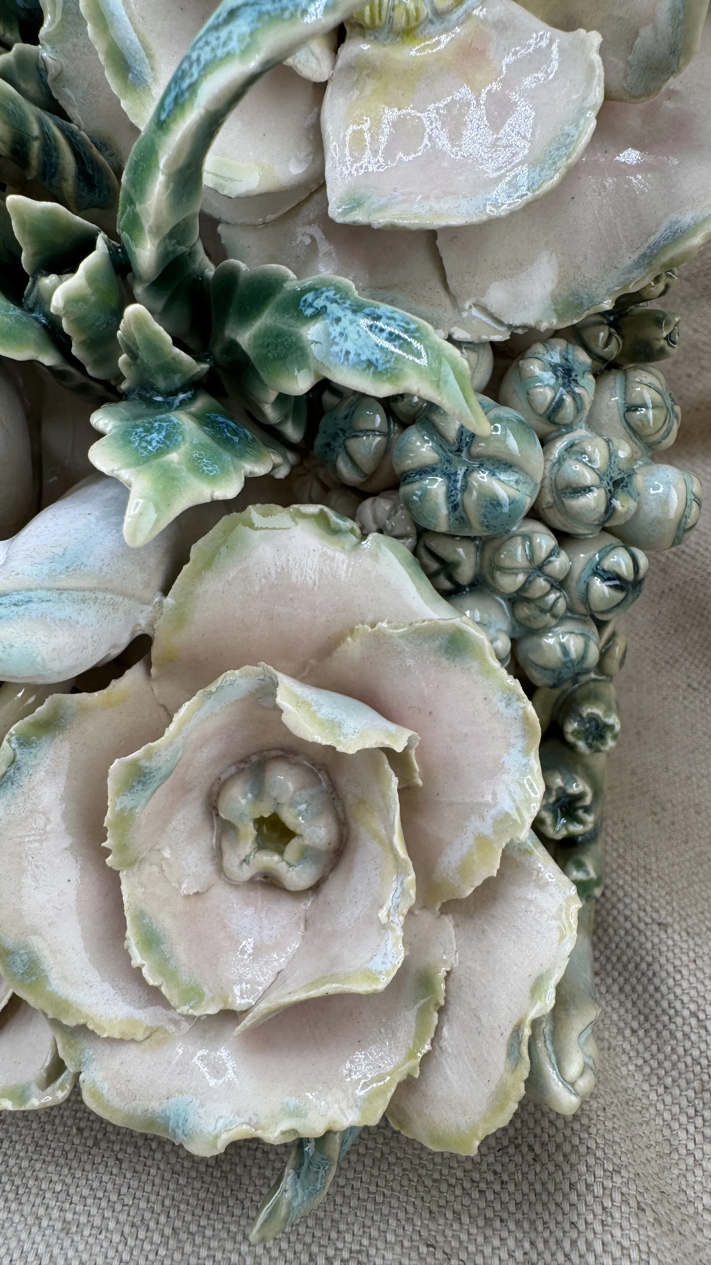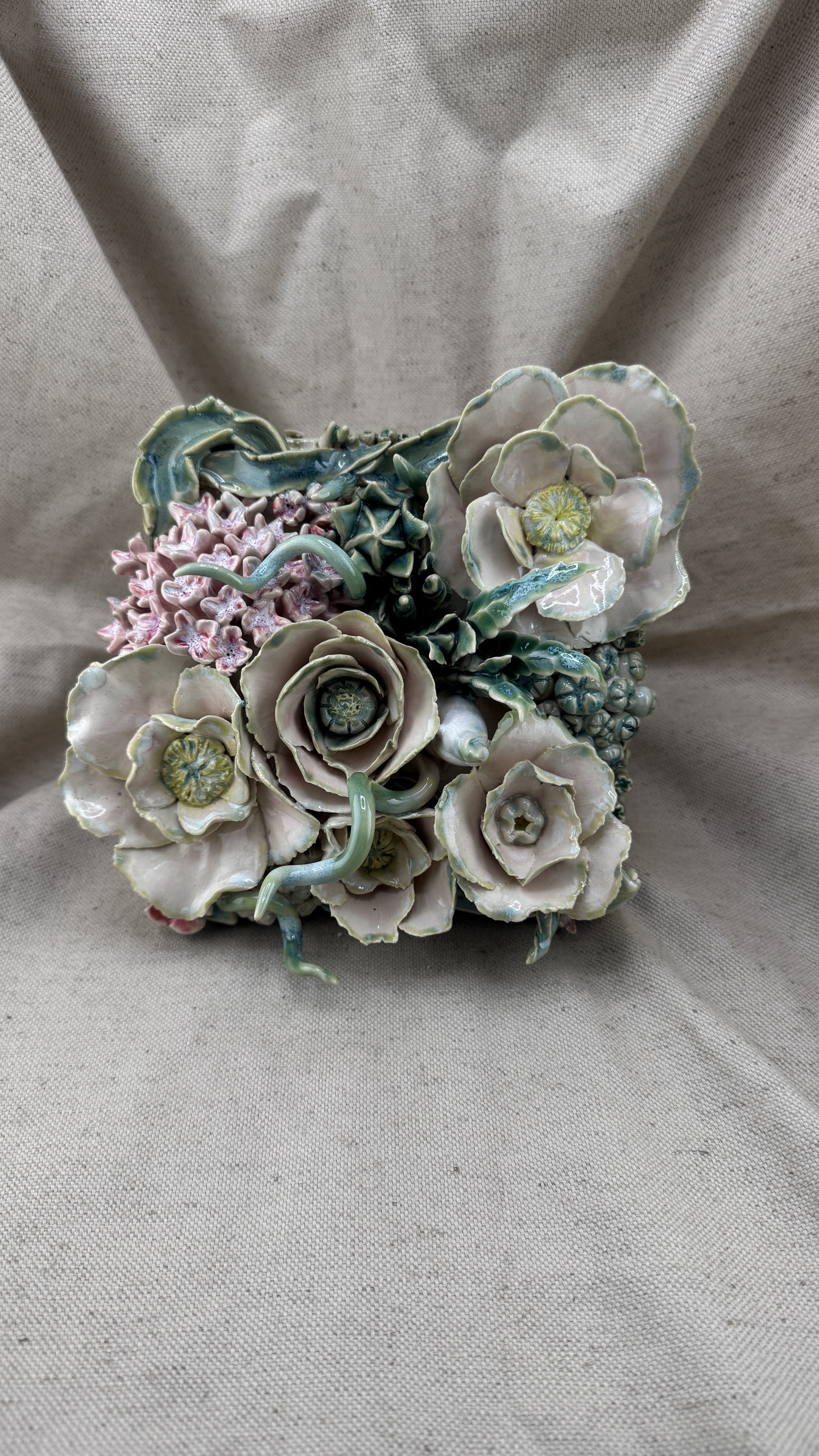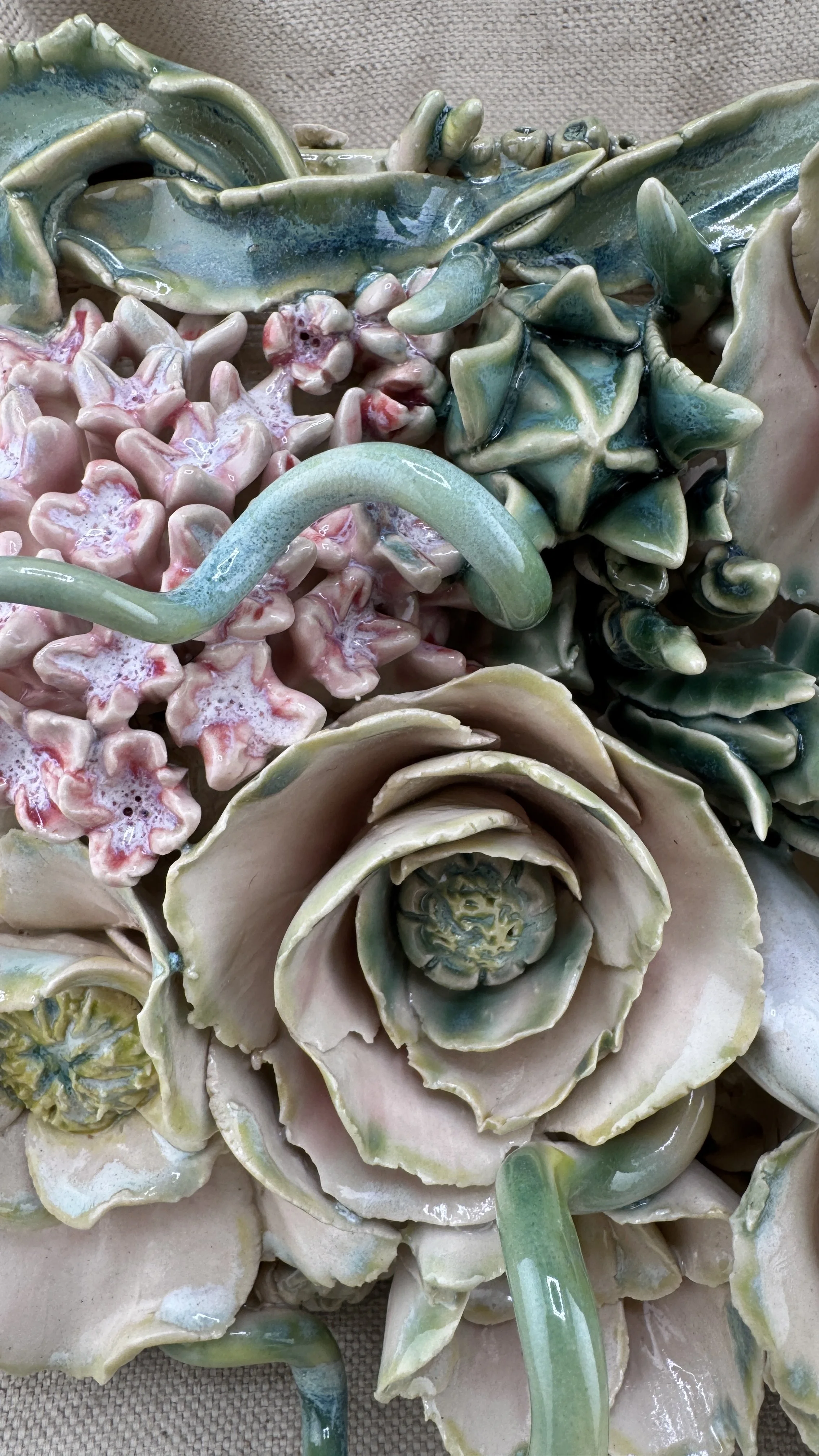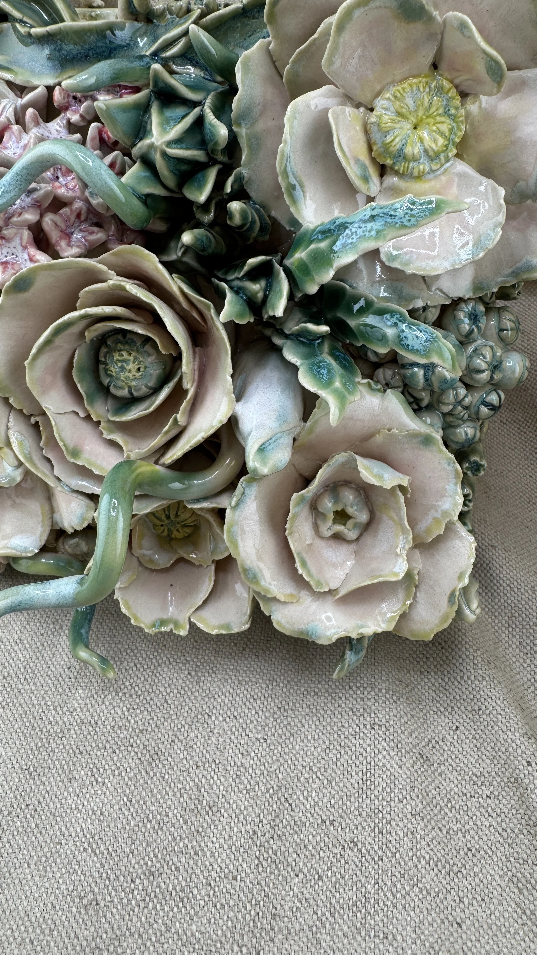 This high-relief stoneware tile features a dense cluster of sculpted flowers (including camellias, succulents, hydrangeas), intertwining tendrils, and buds. The piece is finished in soft pinks, greens, and teals, evoking a lush, dream-like garden.